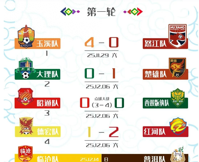昭通0:0西双版纳(点球3:4)。两队在90分钟的比赛中握手言和,随后进行的点球大战中,客场作战的西双版纳队凭借门将1号刀杰的神勇发挥,4:3战胜昭通队,获得宝贵的2个积分。