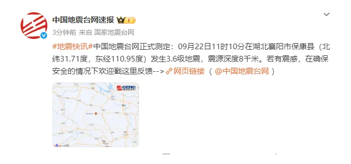 中国地震台网正式测定:09月22日11时10分在湖北襄阳市保康县(北纬31.71度,东经110.95度)发生3.6级地震,震源深度8千米。