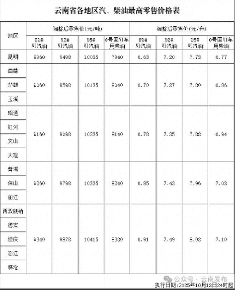 油价今晚下调!云南各地最新零售价公布