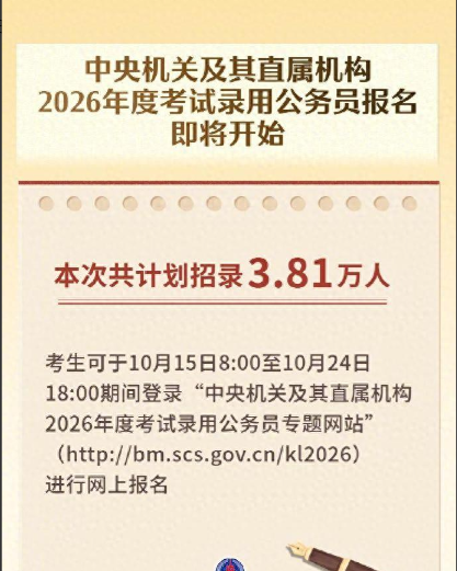 中央机关及其直属机构2026年度考试录用公务员报名即将开始,共计划招录3.81万人。考生可于10月15日8:00至10月24日18:00期间登录“中央机关及其直属机构2026年度考试录用公务员专题网站”进行网上报名,公共科目笔试将于11月30日在全国各直辖市、省会城市、自治区首府和部分城市同时举行。(新华社)