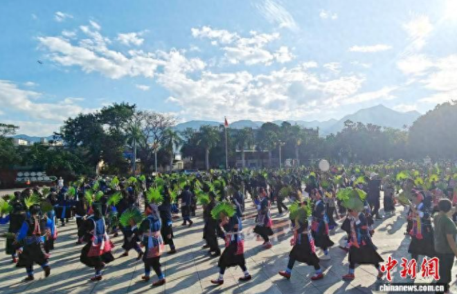 中新网玉溪11月16日电 (苏龙孙)15日,一场规模宏大、别开生面的千人棕扇舞展演在云南省玉溪市元江哈尼族彝族傣族自治县举行。千余名身着民族盛装的各族民众与来自全国各地的游客共同舞动棕扇,场面壮观,气氛热烈。