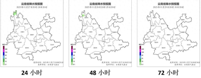 目前,冷锋切变已压过云南,未来受西偏北气流影响。11月27日,迪庆州南部局地会有小雪或雨夹雪落下;11月28日,迪庆州北部局地有小雪或雨夹雪。近期清晨云南中东部和西北部局地有霜,南部局地有大雾,需重点防范霜冻灾害对农业的不利影响。