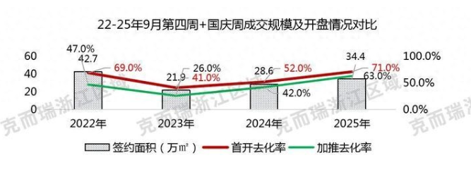 2025年国庆前后的签约面积为34.4万方,同比24年增长20%,较23年大增57%,但不及22年;说明成交规模相比近两年明显放量。
